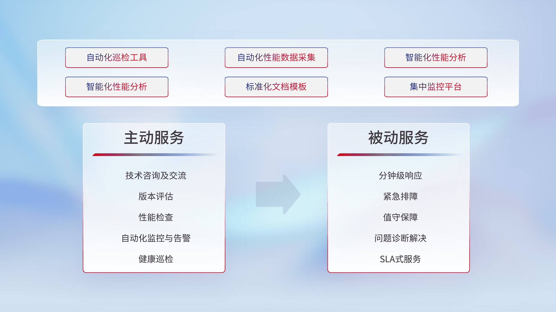 智能化工具和标准化文档,,,,保障服务质量,,提供主动服务(包含技术咨询、、版本评估、、性能检查、、自动化监控与告警、、、健康巡检)和被动服务包含(分钟级响应、、、、紧急排障、、值守保障、、问题诊断解决、、SLA服务)。。。。